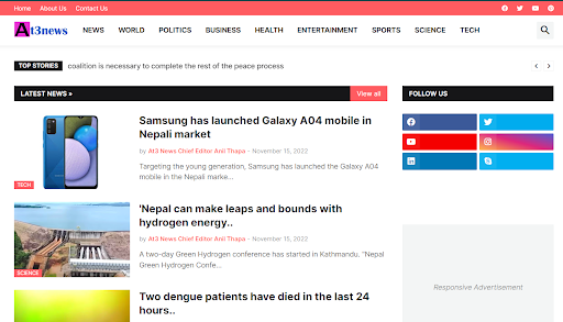 एटिथ्री समाचार अनलाइन समाचार, नेपालमा सबैभन्दा लोकप्रिय अनलाइन समाचार हो यसका कार्यक्रमहरूले आजका समस्याहरूको बारेमा गहन विश्लेषण र जनताको आवाजलाई प्रतिबिम्बित गर्दछ। यसका कार्यक्रमहरूले महत्त्वपूर्ण घटनाहरूको बहुआयामिक प्रभावहरू अन्वेषण गर्दछ, तिनीहरूलाई समाचार बुलेटिन, अन्तर्वार्ताहरु प्रसारण गर्दछ