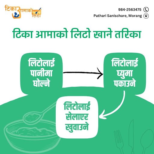 टिका आमाको लिटो: ६ महिना भन्दा बढी उमेरका बच्चाहरूको लागि पोषक घरमै बनाइएको लिटो, जसले शिशुको विकास र वृद्धिलाई सहयोग गर्दछ।
